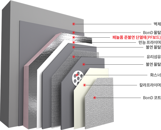 화재안전성은 물론 단열성능이 탁월한 PF보드와 비온디의 외단열마감시스템을 적용하여