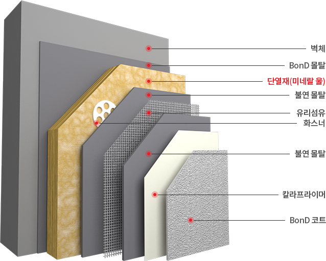 불연성능의 미네랄울보드와 비온디의 외단열마감시스템을 적용하여 건축물의 피난·방화