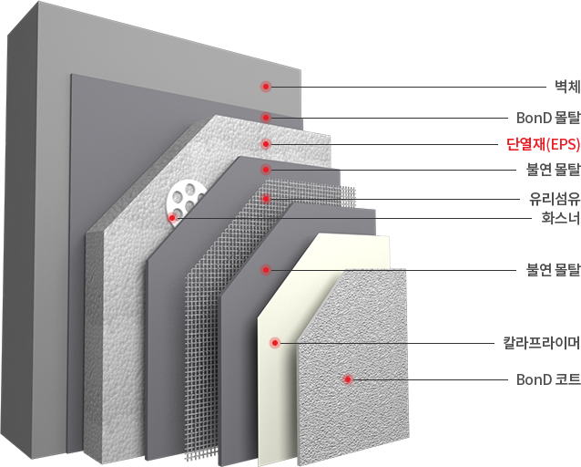 고단열 성능의 비드법 EPS 단열재와 비온디의 외단열마감시스템을 적용하여 단열성능 및