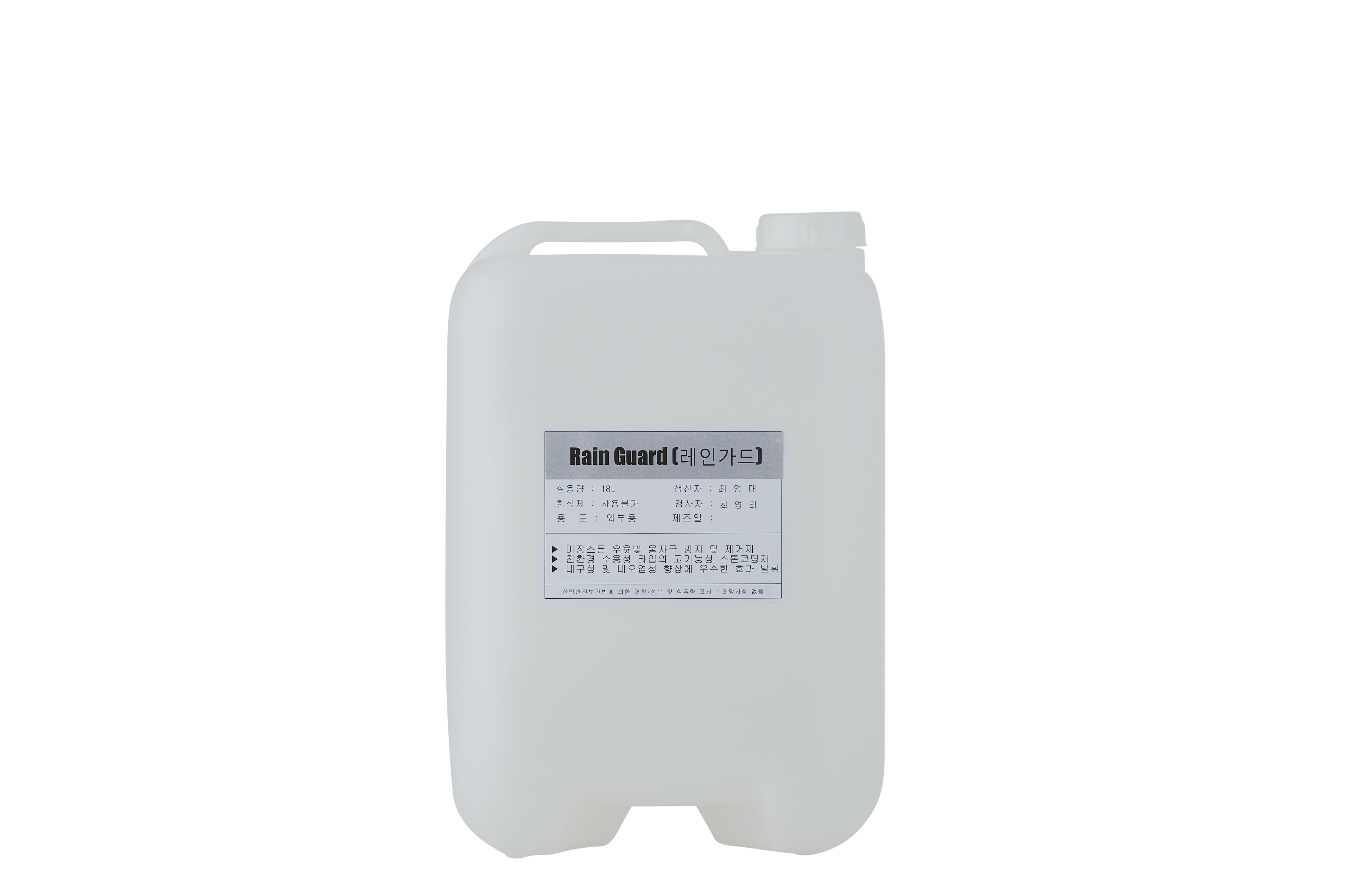 레인가드(Rain Guard)는 특수 아크릴 공중합 에멀젼을 적용한 친환경 수용성 미장 스톤 코팅재로 내구성 및 내오염성이 우수하며, 특히 우천시 우윳빛 물자국 형상 발생을 방지하고, 개선하는데 탁월한 효과를 발휘합니다.