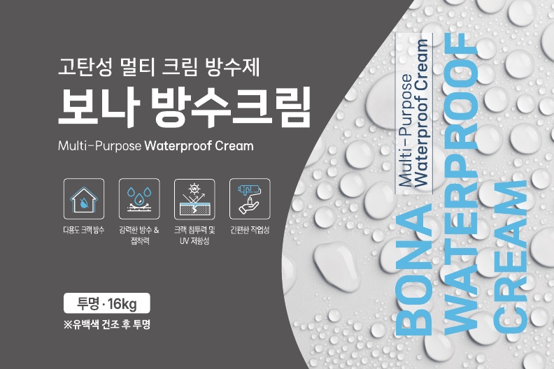 보나 방수크림은 다기능성 방수크림으로서 깊은 침투를 통한 우수한 방수성, 부착성, 내구성 및 자외선 안정성을 보유하고 있습니다.