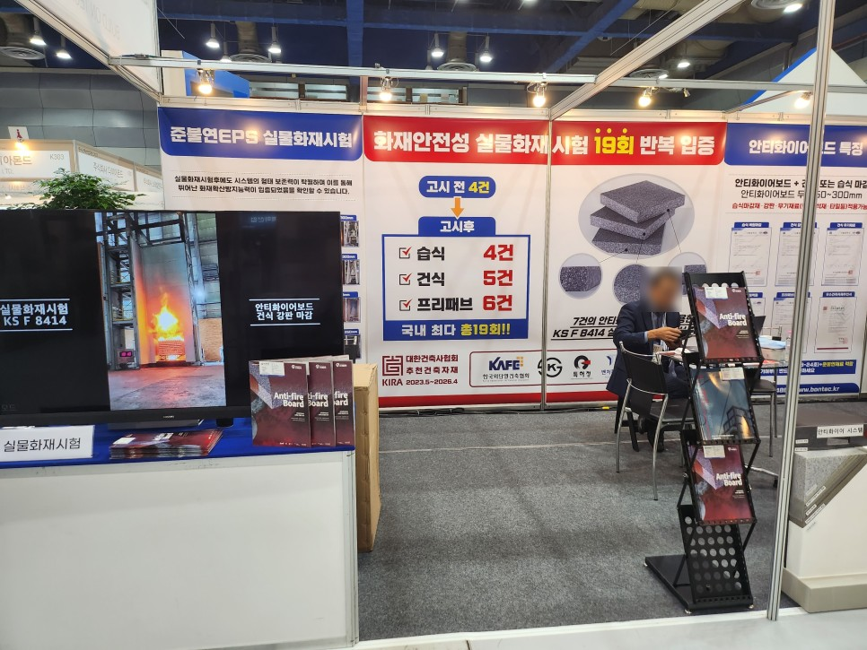 또한, 이번 건축산업대전에서 건축자재 설명회에 참가하여 안티화이어보드를 소개하는 시간이 있었습니다.